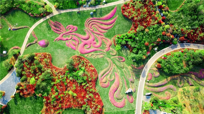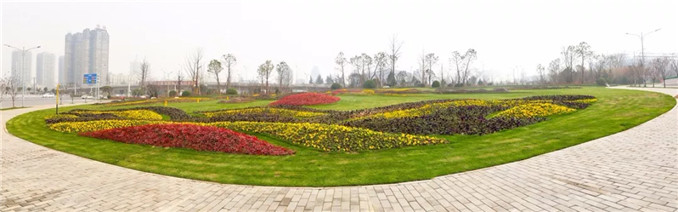 以人文園林特有的植物配置手法,選用抗性強的彩葉植物或觀花植物,組成華麗精致的圖案紋樣。彩葉植物四季有景,觀花植物花開絢爛,組成風格各異的大地畫卷。