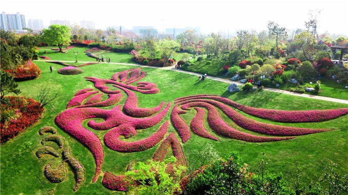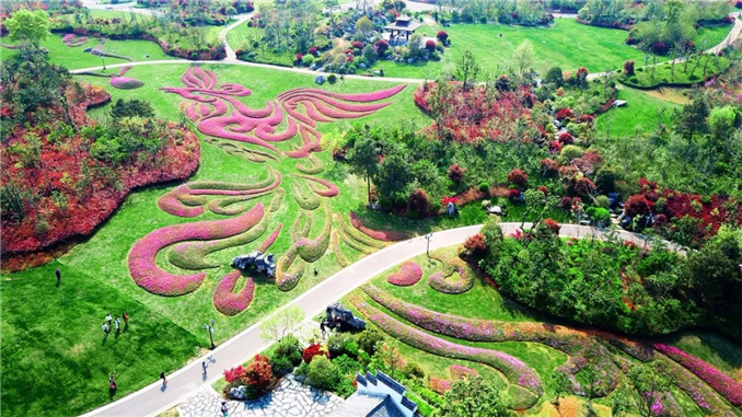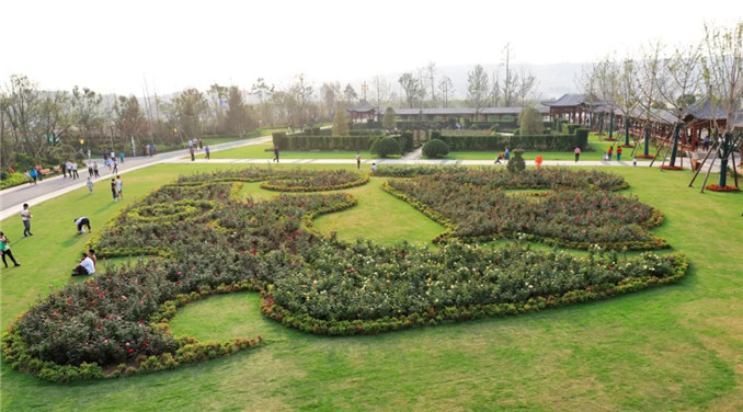 韓城國家文史公園西入口的營造踐行“科藝同構、古今同構、中外同構”的造園理論,在傳統長廊與鼓樓圍合下,用數十品種月季繪成漢代龍鳳圖案,迎接過往游客,也反映了韓城深厚的歷史文化底蘊。