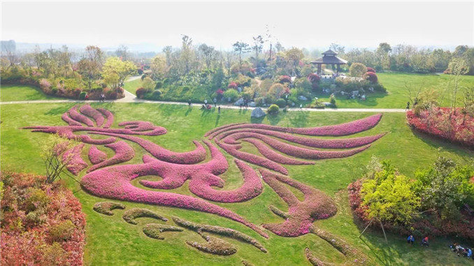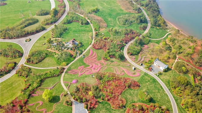 進賢青嵐湖森林公園,以芝櫻(叢生福祿考)為顏料,依地勢在草坪上繪出栩栩如生的鳳凰銜石圖案。大氣奔放、飄然欲舉的鳳凰,在青嵐湖邊自歌自舞,寓意著天下安樂、福澤綿長。