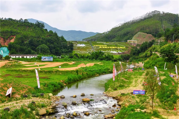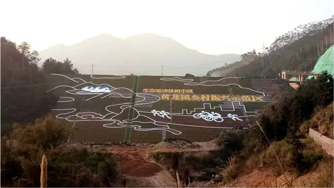 丫山大壩立體綠化的圖案與環境融合,將周邊山體延伸至大壩上;并融入丫山、運動、休閑小鎮、生態、健康等地域特色,將一幅生態運動休閑小鎮的畫面躍然壩上。針對項目特點,選用佛甲草、金葉過路黃、玉龍草等喜陽耐旱矮生植物,確保景觀效果,降低養護成本。