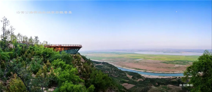 沿黃公路韓城段的景觀營造,猶如在黃河岸邊展開一幅立體長卷,充分展現了中國園林的繪畫美、意境美。位于南段黃河最寬處的船頭形觀景臺,朝向黃河奔流的方向,似欲順流而下,一日千里,是建筑的大地藝術化,寓意在“三十年河東,三十年河西”的滄桑巨變中,高速發展的韓城猶如一艘巨輪啟碇遠航、乘風破浪。在觀景臺上遙望日月升起,極目千里,景象壯闊,正是韓城蒸蒸日上之勢。