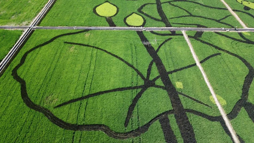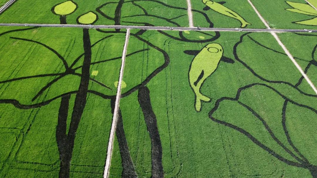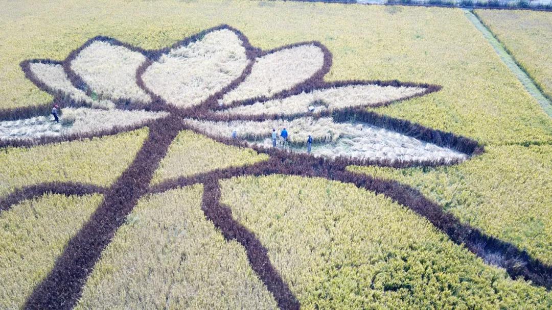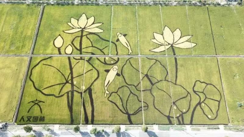 設(shè)計(jì)思路:稻田畫(huà)位于杭州西湖西側(cè),因而取荷花與鯉魚(yú)的西湖特色元素,據(jù)漢樂(lè)府詩(shī)《江南可采蓮》描述的意境,通過(guò)彩色水稻藝術(shù)化的創(chuàng)作了這副《魚(yú)戲蓮葉圖》?!遏~(yú)戲蓮葉圖》的圖畫(huà)中,一對(duì)鯉魚(yú)像夫妻一樣向上游,逆流而上;兩朵開(kāi)花的荷花和兩朵未開(kāi)花的荷包,兩條大鯉魚(yú)和六片荷葉,成雙成對(duì)的水滴,每一環(huán)節(jié)的設(shè)計(jì)都有“偶”意,荷花與鯉魚(yú)同時(shí)象征著連年有余、和和美美的吉祥寓意?!半p花雙蕾雙葉雙魚(yú)游,人文人藝人美人心齊。雙浦雙成,人文人才?!?,稻田畫(huà)用中國(guó)傳統(tǒng)水墨畫(huà)的方式,彩稻為墨、田為紙,將農(nóng)業(yè)園藝化,大地藝術(shù)化。