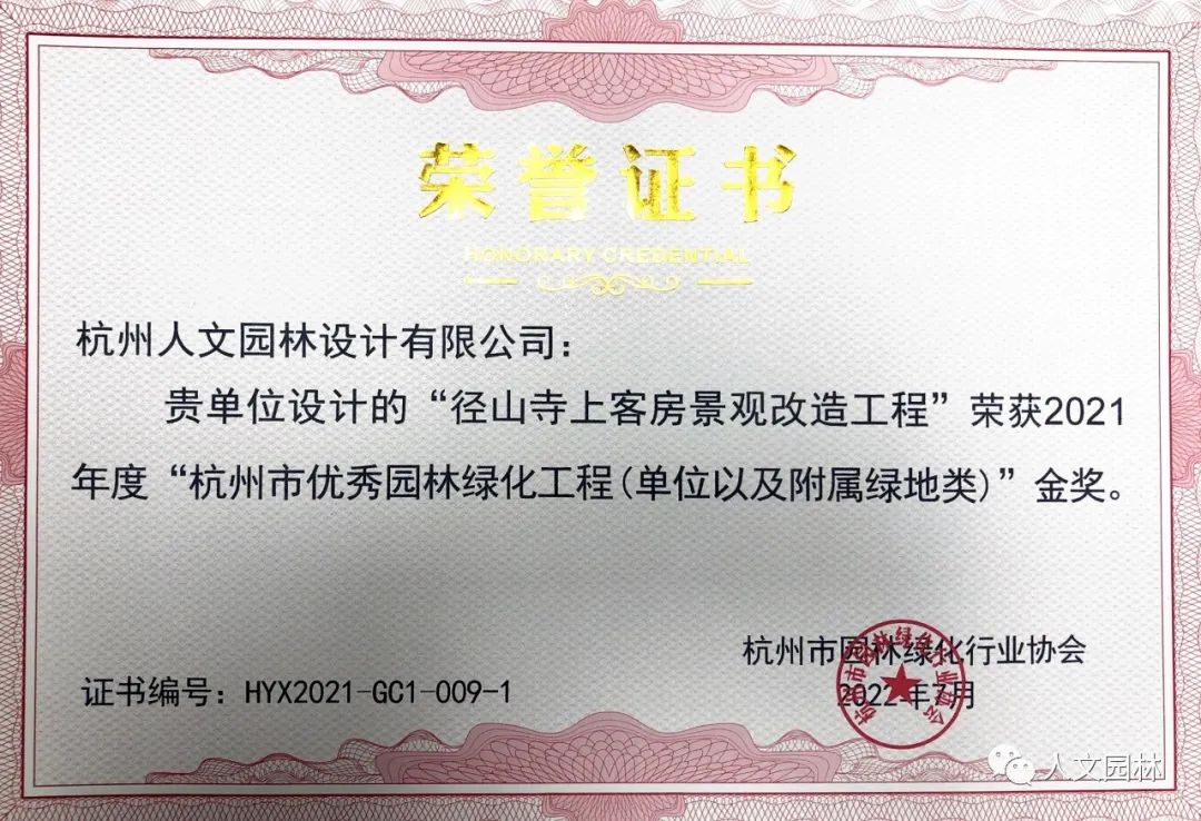 10月13日,杭州市綠化行業(yè)協(xié)會第三屆七次會員大會暨“2021杭州市優(yōu)秀園林綠化工程獎(jiǎng)”頒獎(jiǎng)大會圓滿舉辦。人文園林總獲得3金2銀1銅佳績,其中徑山寺上客房景觀改造項(xiàng)目、杭州亞運(yùn)村技術(shù)官員村二期公寓景觀項(xiàng)目等榮獲金獎(jiǎng)。人文園林將珍惜榮譽(yù)、再接再厲,進(jìn)一步提升提高專業(yè)技術(shù)、建設(shè)品質(zhì)、管理水平,永葆初心,以匠心鑄匠魂,打造更多更優(yōu)的作品。