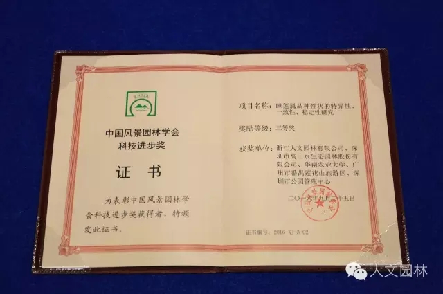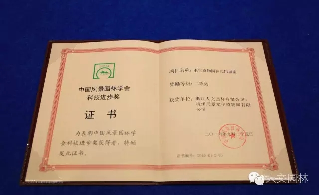2016年9月23日~26日,2016中國風景園林學會年會在廣西南寧隆重召開,并頒發(fā)了2016中國風景園林學會科技進步獎,由浙江人文園林有限公司推出的“人文園林系列叢書”之《水生植物園林應用指南》,獲得2016中國風景園林學會科技進步獎二等獎,浙江人文園林有限公司等單位共同研究的“睡蓮屬品種性狀的特異性、一致性、穩(wěn)定性研究”獲得2016中國風景園林學會科技進步獎三等獎。